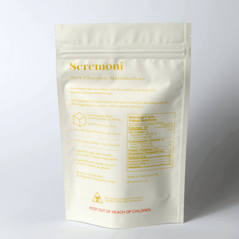These hand crafted dark chocolate freeze dried marshmallows are an incredibly delicious way to consume your dose. They are light, crunchy and so chocolatey! They’re also great floating in Seremoni hot chocolate for a double dose of chocolate and psilocybin.