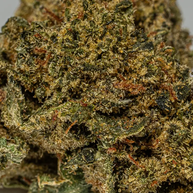 Grease Monkey is an indica dominant hybrid strain created through crossing the classic Gorilla Glue #4 with the delicious Cookies & Cream strain. This potent bud brings on the powerful effects and highly addictive flavor, flawlessly fusing those of its parent strains. With each rich inhale comes flavors of nutty vanilla and sweet skunky diesel. The aroma is just as delicious with an earthy pungency accented by sugary skunky diesel and a touch of vanilla. The Grease Monkey high is a creeper, building up behind the eyes before suddenly taking hold. You’ll suddenly feel a slam to the head of euphoric relaxation that lulls you into a mental state of calm and haze. This effect will quickly become sleepy, easing both mind and body into a completely sedated state that’s calming and relaxing. Thanks to these effects and its super high 22-24% average THC level, Grease Monkey is the perfect choice to treat conditions such as chronic pain, appetite loss or nausea, insomnia, headaches or migraines, and inflammation. This bud has fluffy tapered forest green nugs with sparse orange hairs and a coating of tiny clear crystal trichomes.